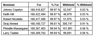 Shareholders elected the following six board members to serve on the company's board of directors until the next annual meeting of shareholders or until their successors are elected or appointed.