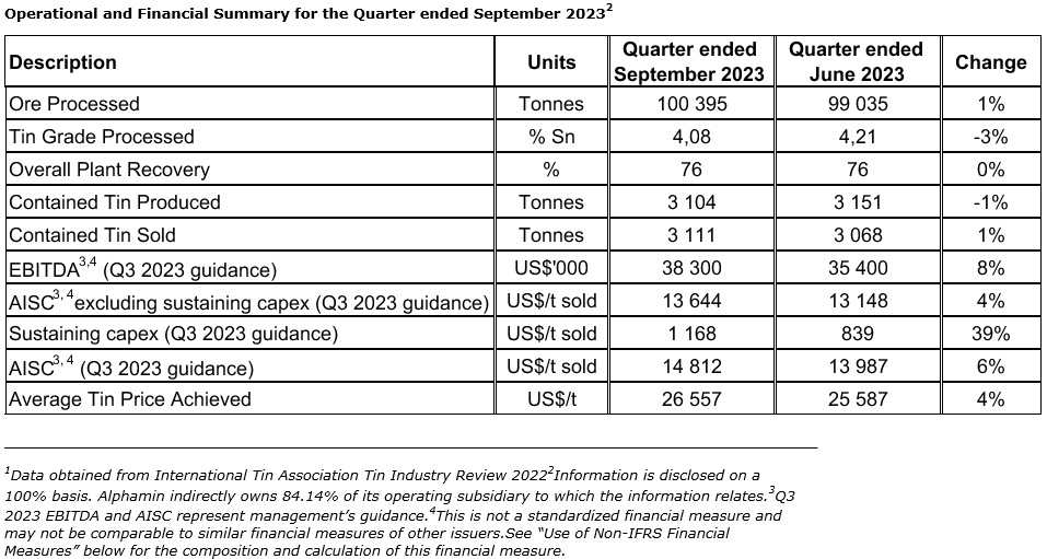 Alphamin Resources Corp. has provided the following update for the quarter ended September, 2023: