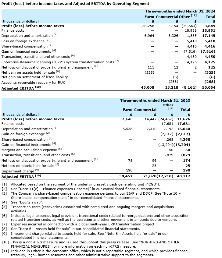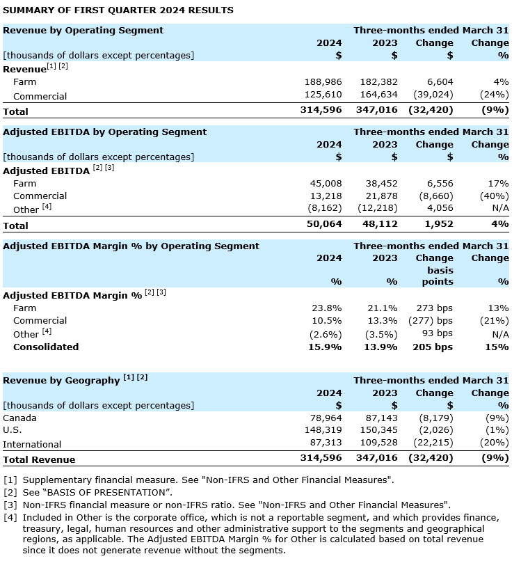 "We are encouraged by our first quarter results, which are largely on track with how we expected the year to begin given our order book mix," commented Paul Householder, president and chief executive officer of Ag Growth. "The increase in first quarter adjusted EBITDA, driven by favourable margins, reinforces our confidence that AGI's profitability levels have structurally expanded. With high activity levels across most areas of the company, we are closely monitoring the North American farm segment where pockets of cautious purchasing behaviour existed through the first quarter and will impact second quarter farm segment results. Over all, we remain confident in our full-year outlook and reaffirm our 2024 adjusted EBITDA guidance of at least $310-million given the support of a near-record level order book and strong commercial activity internationally."