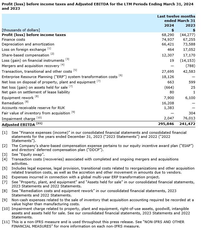 The company reaffirms its previously stated adjusted EBITDA guidance for 2024 of at least $310-million.