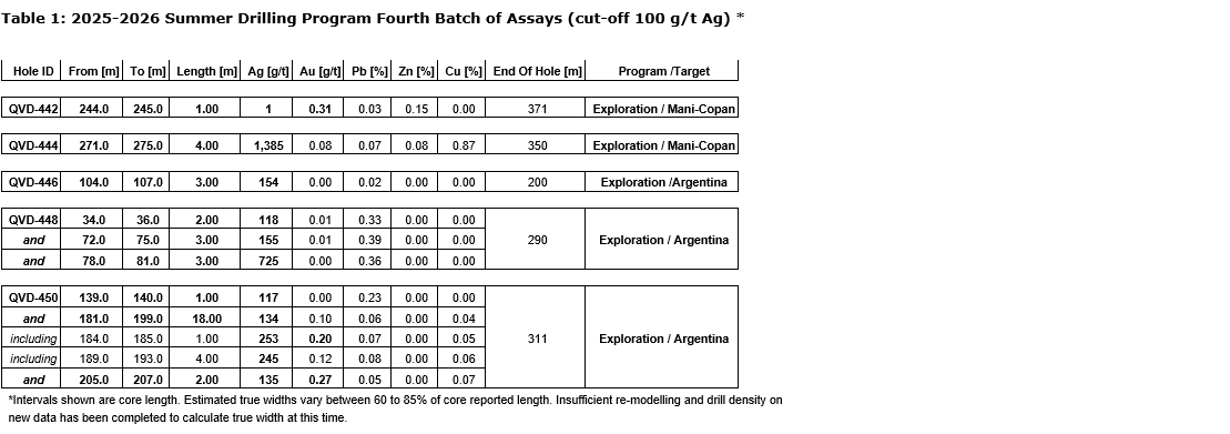 from the eastern edge of the current mineral resource, which hosts 45.3 million ounces of silver from 2.93 million tonnes grading 482 grams per tonne (g/t) silver (Ag) and an inferred resource of 4.1 million ounces from 310,000 tonnes grading 417 g/t Ag (1) (see table 1 and table 2). Notably, drill hole QVD-444 at Mani-Copan intercepted 1,385 g/t Ag over 4.0 metres, successfully validating high-grade results previously identified from surface samples (see news release dated Feb. 23, 2026). Furthermore, the company has discovered a new, previously untested mineralized zone at the Argentina target, where all drill holes have encountered high-grade silver. These findings significantly expand the known mineralized footprint and underscore the vast, district-scale potential of the El Quevar project.
