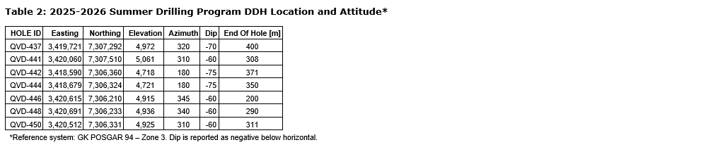 - Hole QVD-450: demonstrated broad mineralization with 134 g/t Ag over 18.0 m (from 181.0 m to 199.0 m), including higher-grade internal of 245 g/t Ag over 4.0 m (from 189.0 m to 193.0 m).