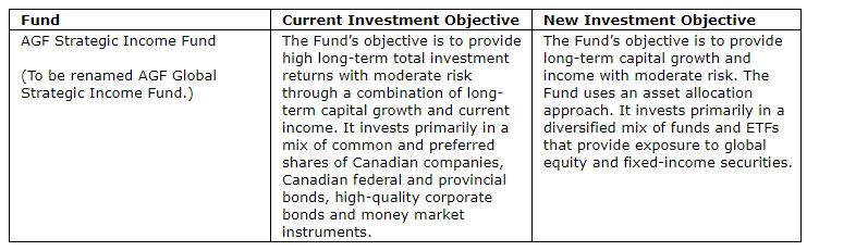 Strategy changes: The investment strategies of the AGF Strategic Income Fund will also be amended to align with the new investment objective of the fund, as further detailed in the management information circular referenced herein.