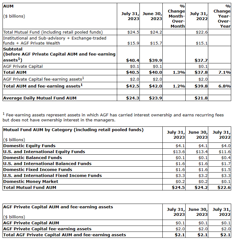 AGF REPORTS JULY 2023 ASSETS UNDER MANAGEMENT AND FEE-EARNING ASSETS