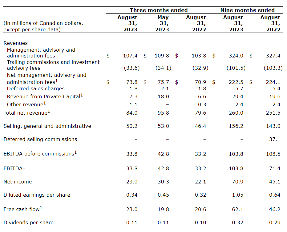 - Net management, advisory and administration fees were $73.8-million for the three months ended Aug. 31, 2023, compared with $70.9-million for the comparative prior-year period. Net management, advisory and administration fees are directly related to the company's AUM levels, the proportion of AUM invested in various strategies (that is, equity fund versus fixed income fund) and commission fee structures (that is, fee-based, front-end or deferred sales commission basis).
