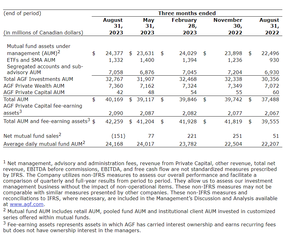 For further information and detailed financial statements for the third quarter ended Aug. 31, 2023, including management's discussion and analysis (MD&A), which contains discussions of non-IFRS (international financial reporting standards) measures, please refer to AGF's website, under about AGF and investor relations, and at SEDAR.
