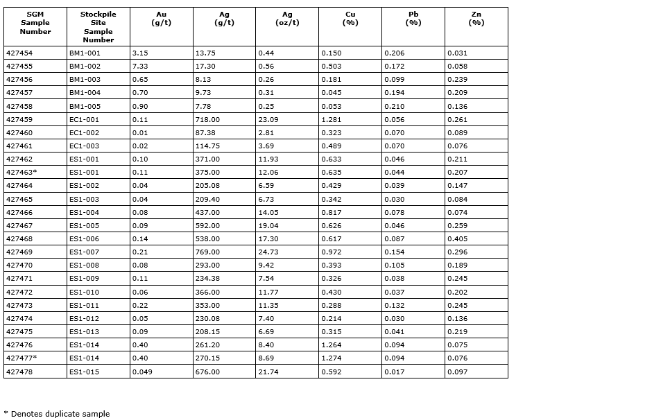 A total of 23 trench samples were collected and submitted for analysis, from the company's three separate stockpile properties: the ES1, EC1 and BM1, respectively. All samples were delivered to the Servicio Geologico Mexicano (SGM) lab in Oaxaca, Mexico, for multielement and fire assays. The assay results are listed in the attached table.