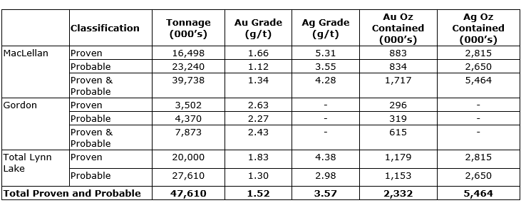 An updated proven and probable mineral reserve totalling 47.6 million tonnes, grading 1.52 g/t Au and 3.57 g/t silver (Ag), containing 2.3 million ounces of gold and 5.5 million ounces of silver, has been declared at Lynn Lake. This represents a 44-per-cent increase from the 1.6 million ounces included in the 2017 study, reflecting the successful conversion of measured, indicated and inferred mineral resources at the Gordon and MacLellan deposits, and 13-per-cent increase from the end of 2022, reflecting the higher gold price assumption. Only mineral reserves have been incorporated into the 2023 study mine plan and economic analysis.