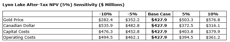 Lynn Lake's economics were estimated as part of the feasibility study process and incorporate only proven and probable mineral reserves. The project economics are sensitive to metal price assumptions, foreign exchange and input costs as detailed in the attached tables.