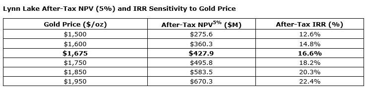 Lynn Lake's estimated base case after-tax IRR is 17 per cent and after-tax NPV (5 per cent) is $428-million assuming a gold price of $1,675 per ounce and U.S.-dollar/Canadian-dollar foreign exchange rate of $0.75:1. Payback is expected to be achieved in 3.7 years under the base case scenario.