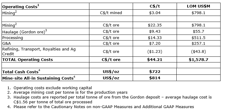 Total operating costs are expected to average $44.21 (Canadian) per tonne of ore processed. This includes average mining costs of $3.04 (Canadian) per tonne of material mined across the Gordon and MacLellan deposits and haulage costs of $9.43 (Canadian) per tonne of ore from the Gordon deposit.
