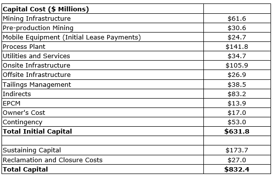 - Initial capital of $632-million and life-of-mine capital, including sustaining capital and reclamation, of $832-million increased from the 2017 study, reflecting inflation and scope changes with the larger operation and mineral reserve;