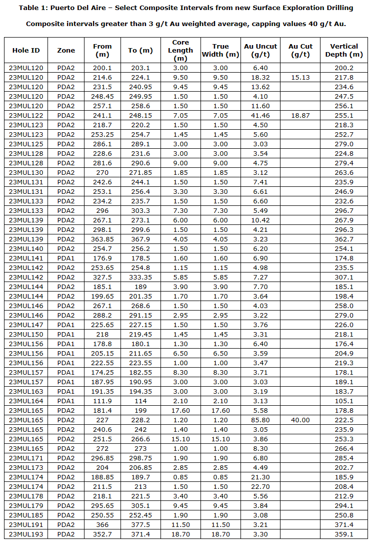 85.80 g/t Au (40.00 g/t cut) over 1.20 m (23MUL165);