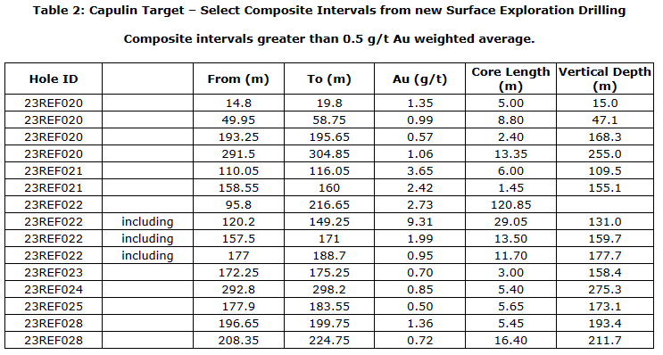 Step-out drilling continues to intersect wide, significant intervals of oxide and sulphide gold mineralization within a breccia adjacent to the Capulin fault. This includes the best hole drilled to date at Capulin (23REF022), a 25-metre (m) step-out from the previously reported initial hole drilled in this area 23REF012 (2.01 g/t Au over 82.45 m core length,