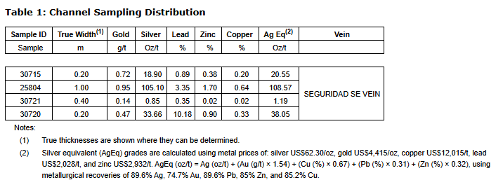 Channel sampling along a 550-metre segment of the central portion of the Seguridad SE vein, located approximately 2.1 kilometres north of the Reliquias mine, returned a weighted average grade of 2,003 grams per tonne silver over an average true vein width of 0.45 metre. These results indicate that high-grade silver mineralization may remain open along strike, both at the Seguridad SE vein and in other nearby veins belonging to the same structural system.