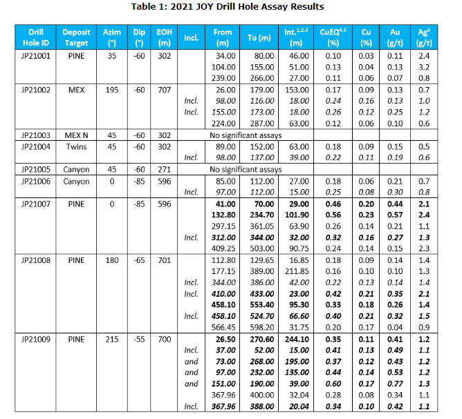 AMARC PROVIDES UPDATE ON JOY COPPER-GOLD DISTRICT, BC: INITIAL 2021 DRILLING EXPANDS PINE DEPOSIT, INTERSECTING 101.9 M OF 0.56% CUEQ1, ADDITIONAL LARGE-SCALE PORPHYRY COPPER-GOLD DEPOSIT TARGETS CONFIRMED