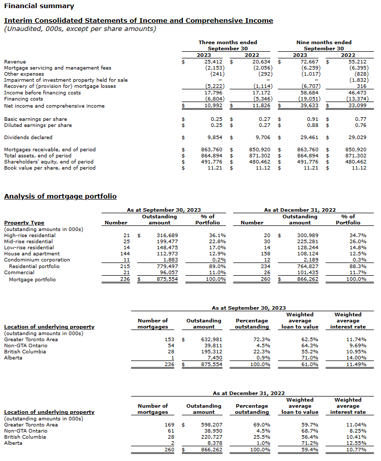 For the three months ended September 30, 2023, Atrium reported assets of $864.9 million at quarter end, down from $874.8 million at the end of 2022. Revenues were $25.4 million, an increase of 23.2% from the third quarter of the prior year. Net income for the third quarter of 2023 was $11.0 million, a decrease of 7.1% from the comparative period. Atrium's allowance for mortgage losses at September 30, 2023 totaled $17.8 million, or 2.03% of the gross mortgage portfolio, up from $10.7 million or 1.24% as at December 31, 2022, to reflect increased credit risk in the real estate markets.