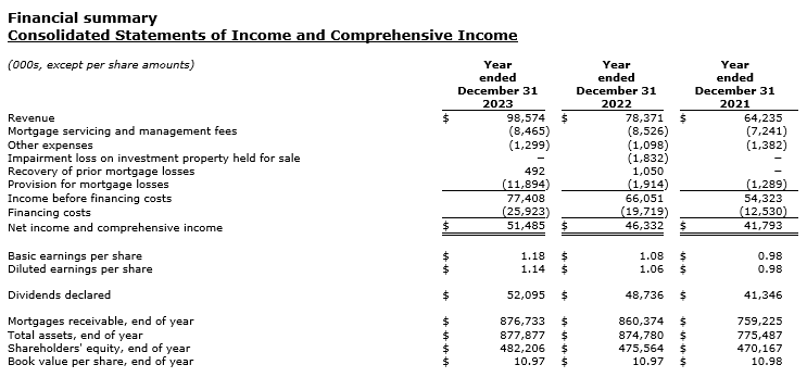 "Two thousand twenty-three proved to be an exceptional year for Atrium and its shareholders. The business posted record earnings per share of $1.18 and an outsized special dividend of 29 cents per share. These results were achieved amid one of the most challenging real estate markets since the early 1990s. In 2023, we managed to capitalize on high-quality opportunities arising from reduced activity by institutional lenders, while still maintaining a conservative portfolio loan to value of 61.4 per cent and increasing our percentage of first mortgages to 94.6 per cent. Our total allowance for mortgage losses of 253 bps reflects a pro-active approach of recognizing increased credit risk in these uncertain economic conditions. We are hopeful that market conditions will improve in the latter half of 2024 but remain prepared to navigate through the current cycle with ample liquidity and tight risk parameters.