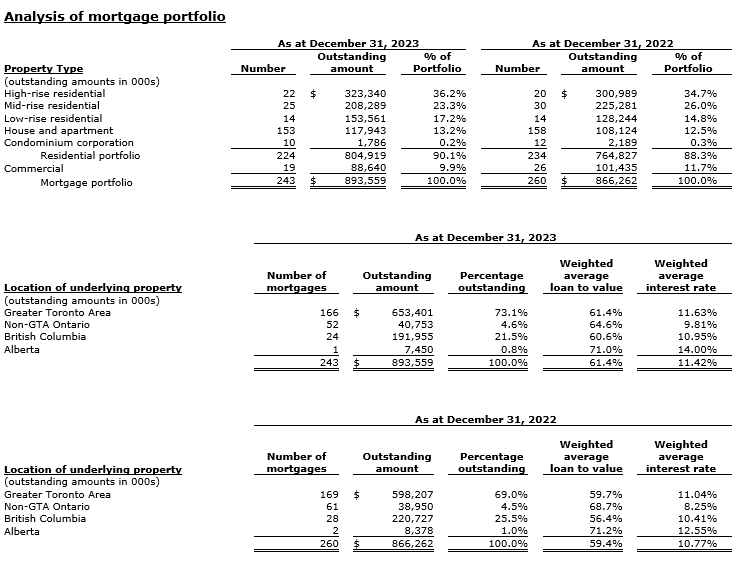 Mortgages receivable as at Dec. 31, 2023, was a record $876.7-million, up from $860.4-million as at Dec. 31, 2022. During the year ended Dec. 31, 2023, $281.5-million of mortgage principal was advanced and $263.6-million was repaid. The weighted average interest rate on the mortgage portfolio at Dec. 31, 2023, was 11.42 per cent, compared with 10.77 per cent at Dec. 31, 2022.