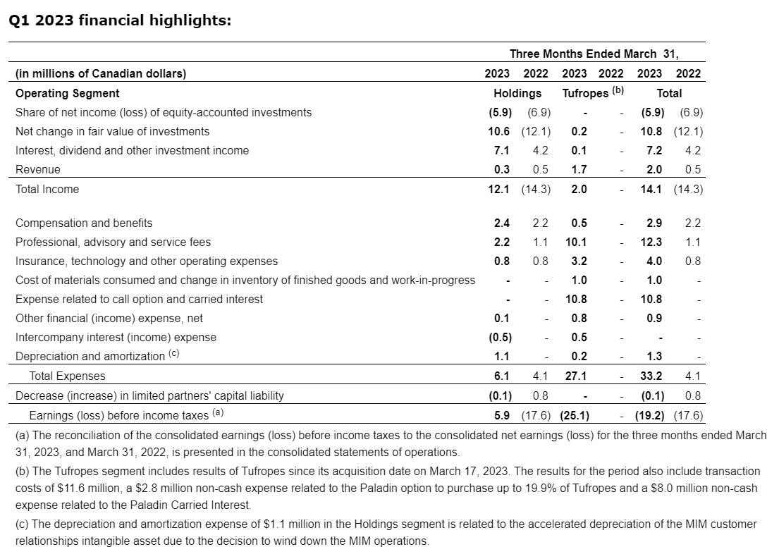 Holdings Segment Results for Q1 2023