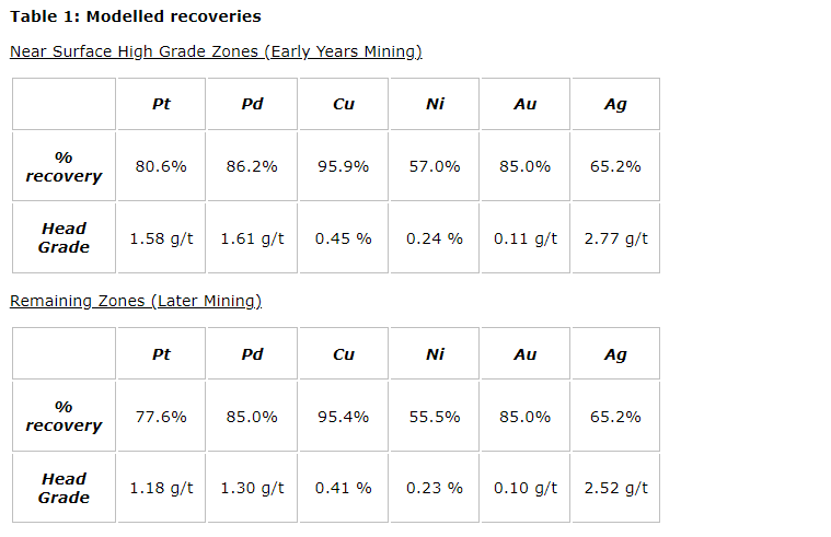 Preliminary modelled concentrate grade outlined the potential for a clean copper concentrate grading 22 per cent Cu, 38 g/t Pt plus Pd and a PGE Ni rich concentrate grading 50 g/t Pt plus Pd and 3.75 per cent Ni. Through an engagement with Ocean Partners Inc., it was identified that projected concentrates produced were marketable with interest and indicative terms received from several domestic and overseas smelters.