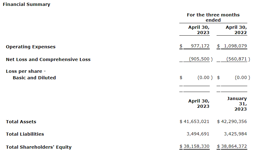 The company also announces that it has filed its unaudited consolidated interim financial statements and management's discussion and analysis for the three month period ended April 30, 2023, available for viewing on SEDAR.