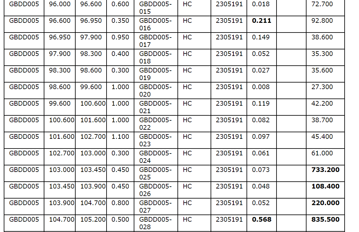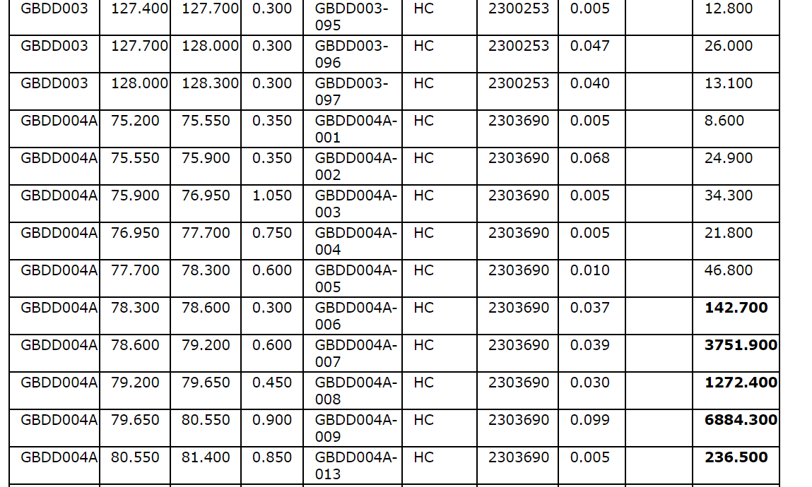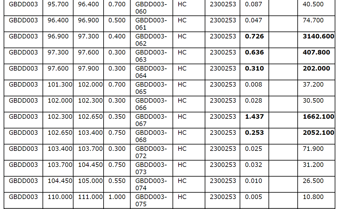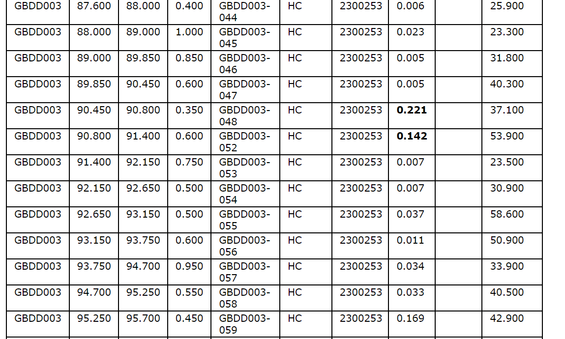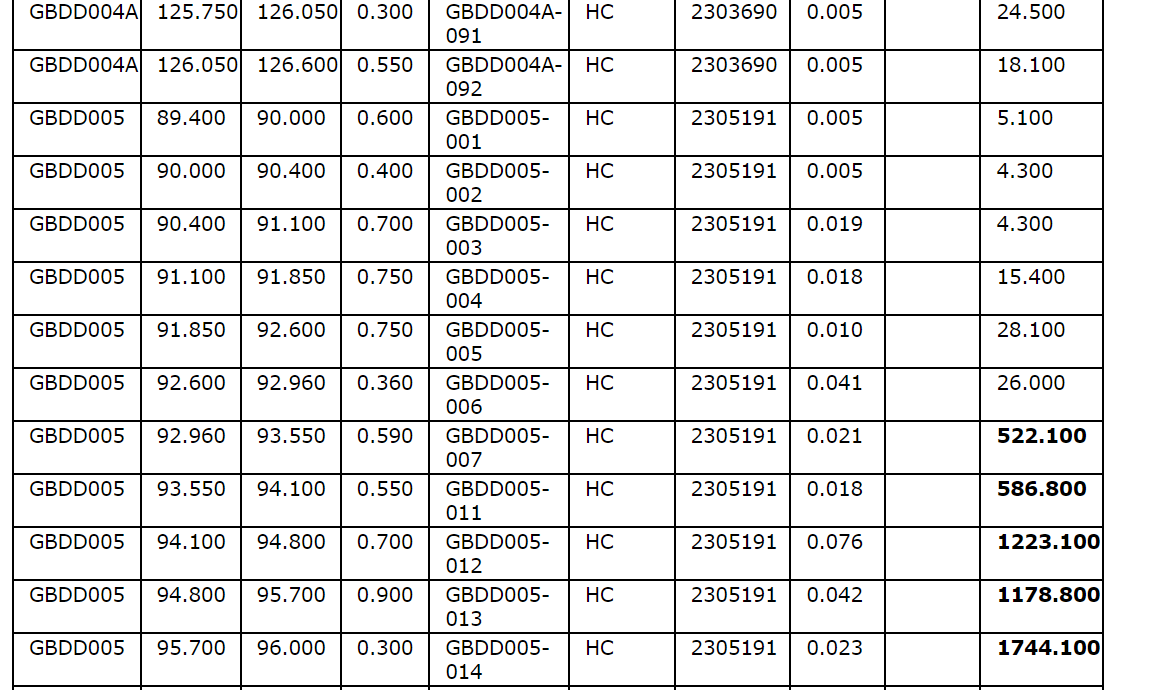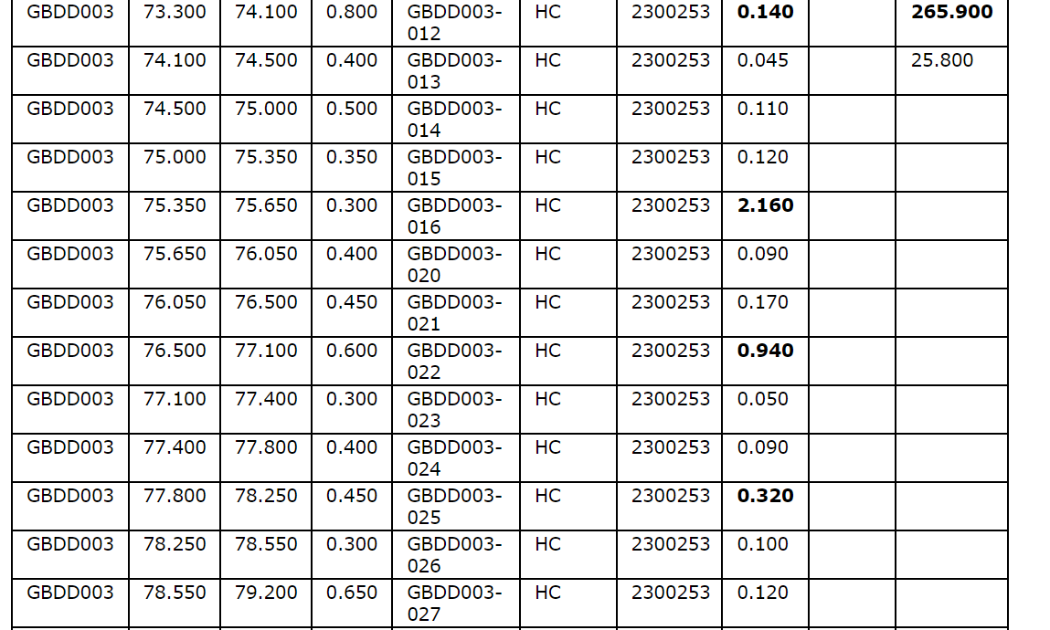Drill hole GBDD003 returned 1.75 metres (75.35 m to 77.1 m) at 1.57