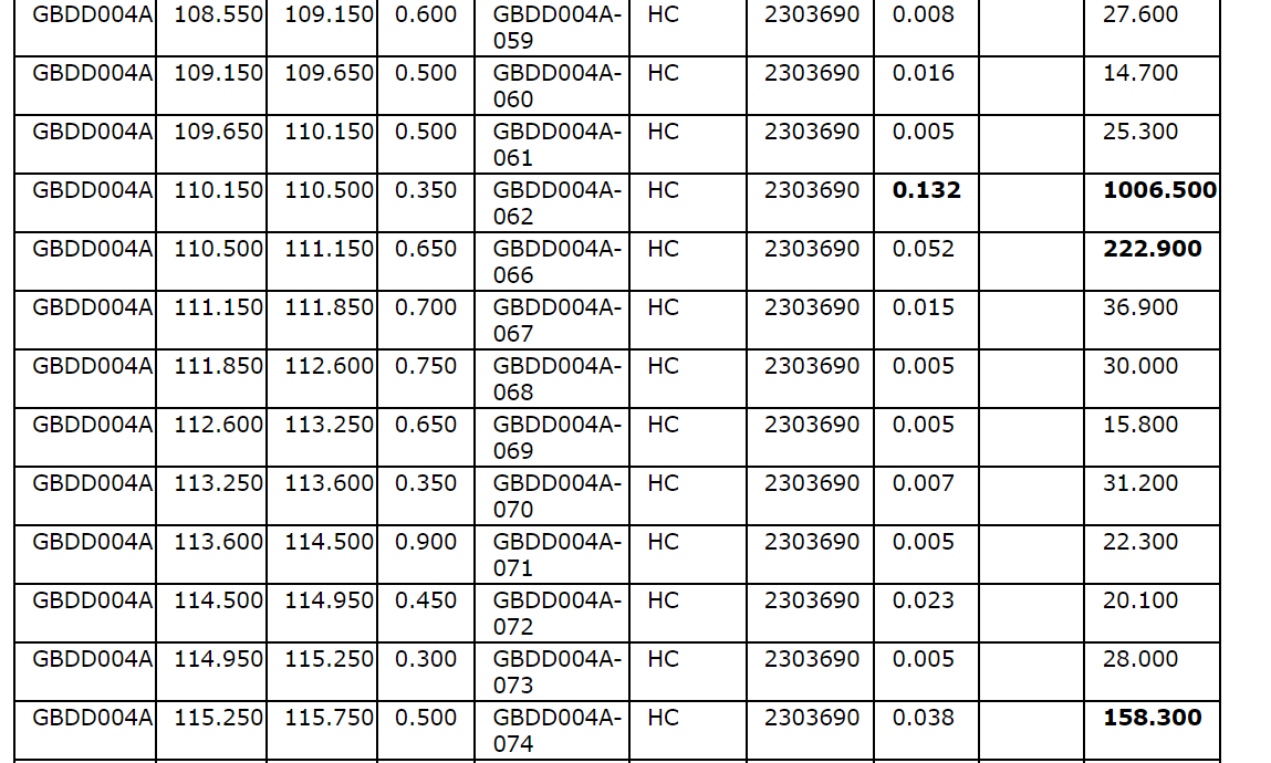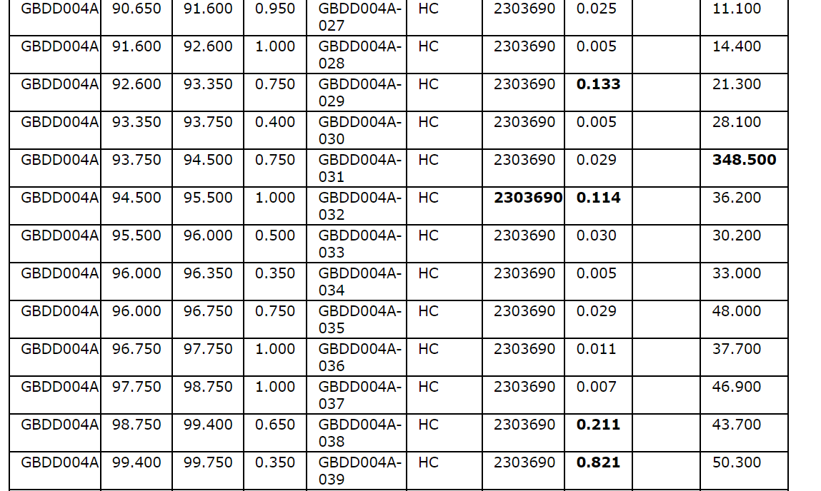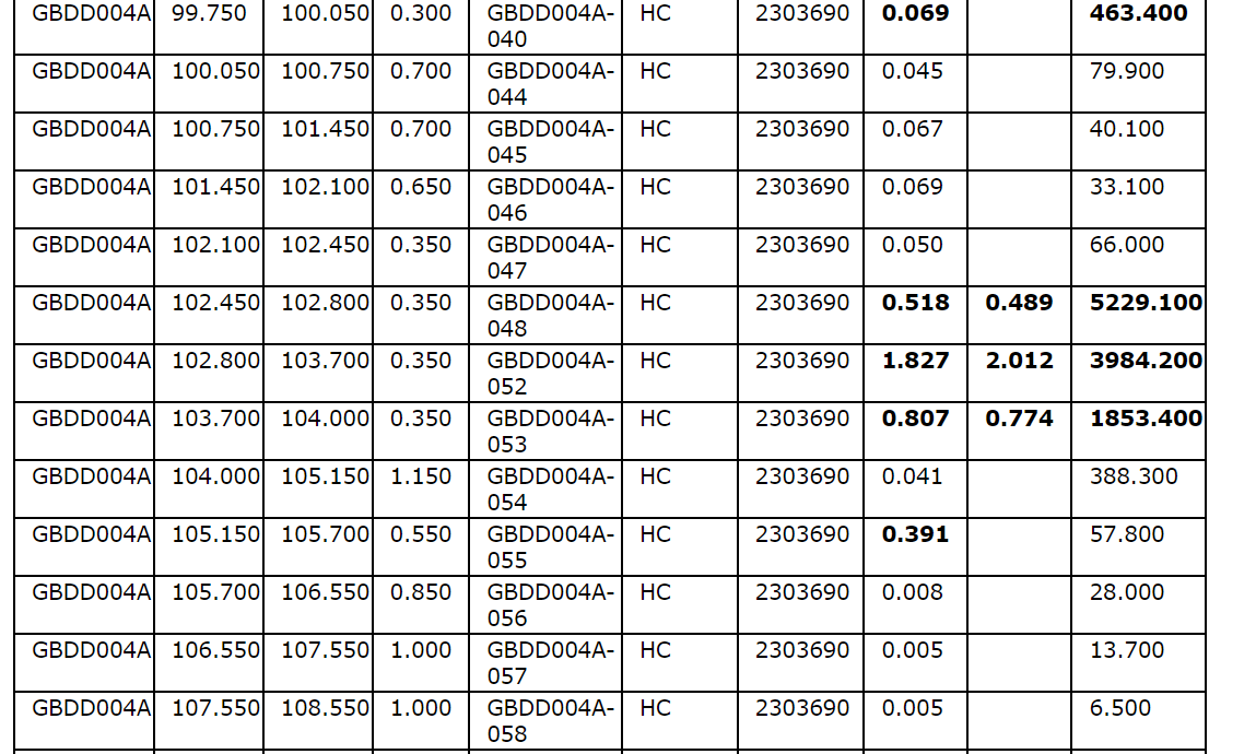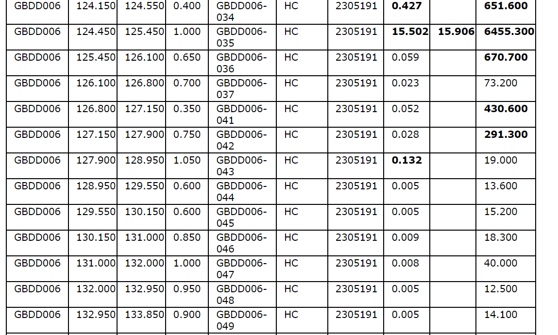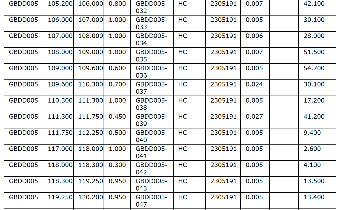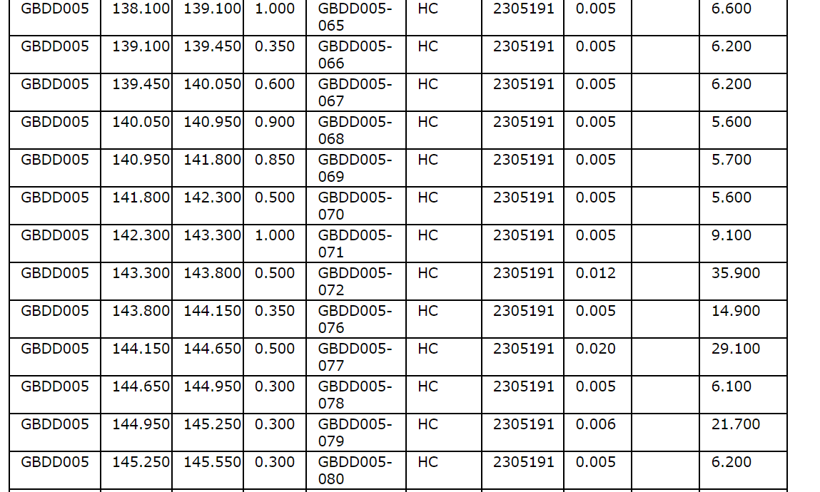 Drill hole GBDD003 returned 1.75 metres (75.35 m to 77.1 m) at 1.57