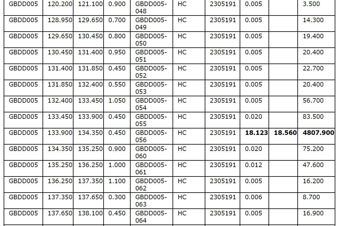 - Significant results from GBDD005 include 0.45 m at 18.56 g/t Au and 4,807 parts per million arsenic.