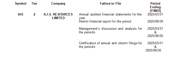 A cease trade order was issued by the British Columbia Securities Commission on Oct. 2, 2025, against A.I.S. Resources Ltd. for failing to file its financials, as detailed in the attached table.