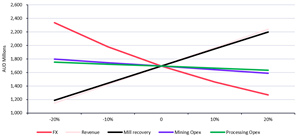 | NPV ranges and sensitivity to variations in the significant assumptions and inputs. | The cashflow model has been tested for sensitivity to key economic assumptions. As is typically found, the revenue assumptions (e.g., sale price, USD:AUD exchange rate, head grade, plant recovery) have a much greater influence than cost assumptions (e.g., operating costs, capital costs). At 20% individual variances to any of these variables the project remains robustly economic over life of mine and generates positive cashflows. Stripping Ratio is generally a proxy for risk, and the individual stages of the overall project (as currently evaluated) have quite different stripping ratios than the overall project average. The NPV sensitivity to key variables is therefore significantly different if analysed by stage. If the most sensitive stage (Stage 4-1) is assessed by the most influential variable (Revenue) at the most negative value (-20%), the cashflow is weakly positive whilst the NPV falls to zero. The following stage (Stage 4-2) and the sum of the two stages (Stage 4-1 + Stage 4-2) remain with strongly positive cashflows and NPV’s when Revenue is tested at -20%.