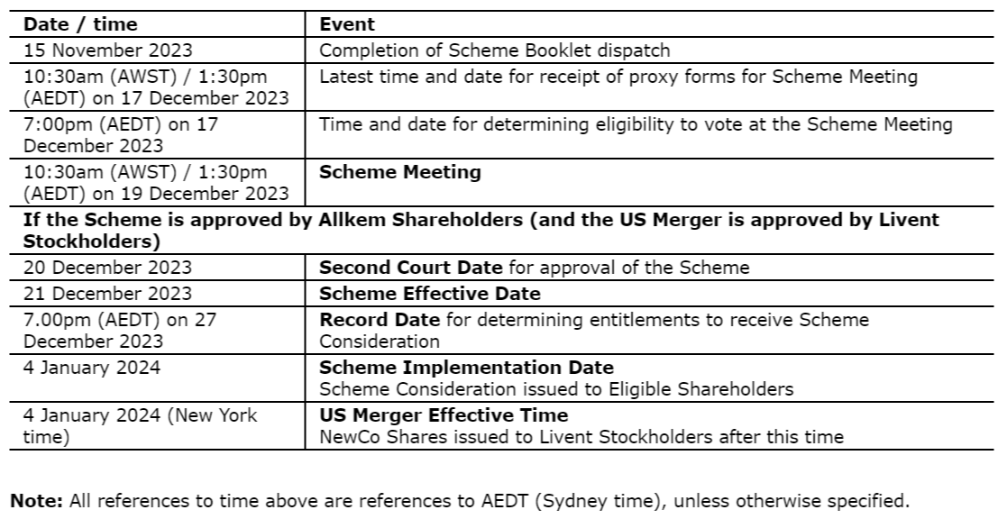 The key dates expected for the transaction are set out in the attached table. Allkem will continue to update shareholders about any material developments in relation to the transaction or the indicative timetable for the transaction as the timetable progresses.