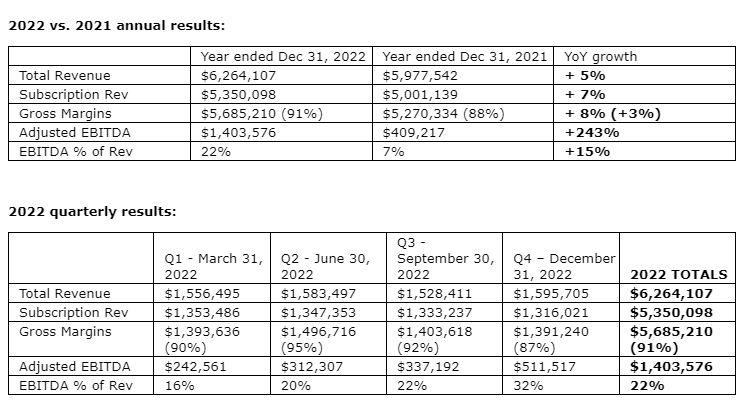 The complete financial results for Ackroo, along with management discussion and analysis for the year ended Dec. 31, 2022, are available under the profile for the company on SEDAR. Highlights are shown in the attached table.