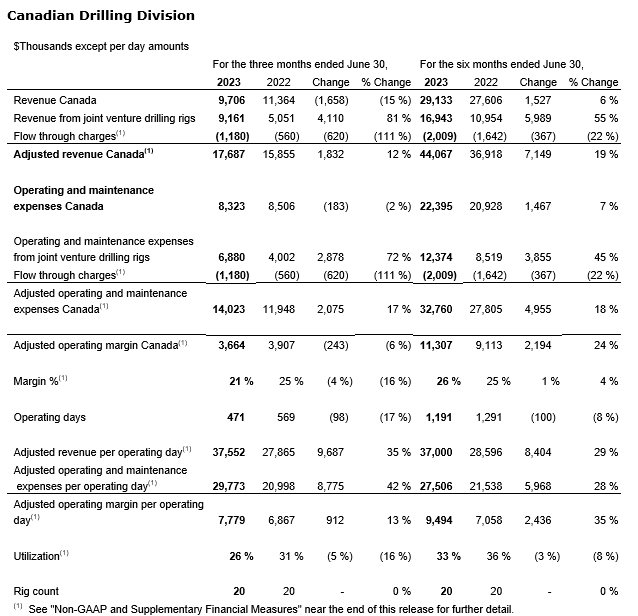 Adjusted revenue in Canada increased to $17,687,000 in the second quarter of 2023 from $15,855,000 in the second quarter of 2022 despite fewer operating days. The day rate increases that were achieved in the second half of 2022 increased adjusted revenue per operating day to $37,552 in the second quarter of 2023, from $27,865 in the same period of 2022. These rate increases were reflected in all of the company's rig categories.