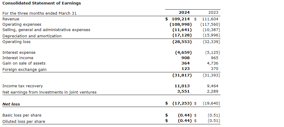 Net loss decreased 12 per cent to $17,253 compared with $19,640 in 2023. Basic and diluted loss per share were 44 cents compared with 51 cents. Results for 2023 included a $3,481 after-tax gain on the sale of two vessels in the product tankers segment.