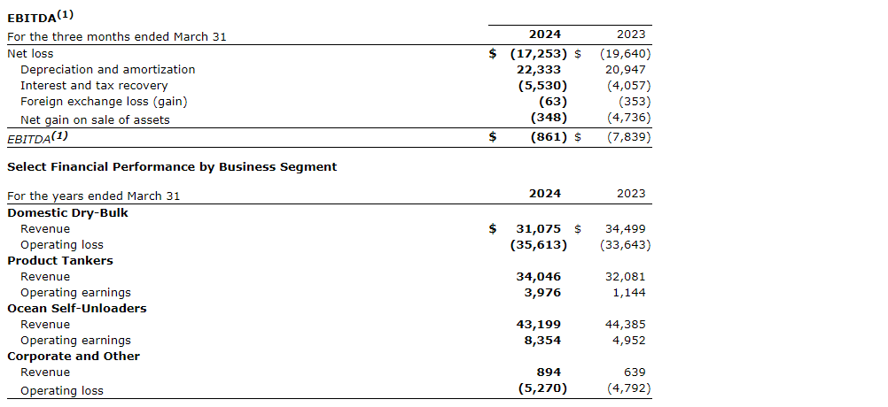 Algoma Central Corp. today released its results for the three months ended March 31, 2024. Algoma reported revenues of $109,214, a 2-per-cent decrease compared with the same period in 2023. Net loss for 2024 was $17,253 compared with a net loss of $19,640 for the same period in 2023. Prior-year first quarter results included a $3,481 after-tax gain from the sale of two vessels in the product tankers segment. Excluding this gain, the 2024 first quarter loss was 25 per cent lower than the prior year. Due to the closing of the canal system and the winter weather conditions on the Great Lakes-St. Lawrence Seaway, the majority of the domestic dry-bulk fleet does not operate for most of the first quarter. All amounts reported below are in thousands of Canadian dollars, except for per-share data and where the context dictates otherwise.