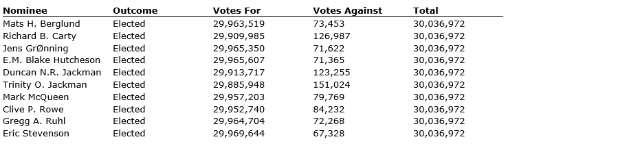 All nominees listed in the management information circular were elected as directors until the next annual general meeting of shareholders, with the support of 74.13 per cent of shares voted.