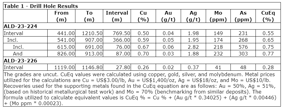 Hole ALD-23-224 was drilled in an area with limited previous drilling and was designed to test a coincident MT (magnetotelluric) and DCIP (direct current, induced polarization) resistivity geophysical anomaly while at the same time testing a 500-metre gap between previously released ALD-22-221 (see company news release dated Aug. 19, 2022) and ALD-22-223 (see company news release dated March 1, 2023). Hole ALD-23-224 was terminated at 1,210.50 m and intercepted long runs of mineralization that extend the mineralized footprint well beyond the 2021 resource estimate model.
