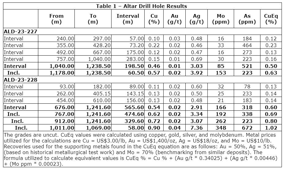 "Both holes reported today demonstrate that the new Altar United trend continues to deliver solid runs of higher-grade mineralization that build onto the previous higher-grade intercepts reported recently in holes 223, 224 and 225B. With these new results, it's clear that Altar United is delivering continuity of higher-grade mineralization, within an already very large Altar system, that will add additional higher-grade tonnage. The upper portions of holes 227 and 228 both drilled through less favourable rhyolite host rocks, and while they didn't return exceptional grades, it demonstrates that even poor host rocks can be mineralized in this strong system. The lower-grade intervals reported today will likely report to resource at a break-even cut-off grade, which typically hovers around 0.1 per cent CuEq, thus potentially reducing the strip ratio."