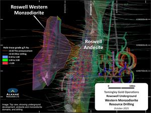 A significant portion of the Roswell underground Inferred Resources (408 kt grading 1.9 g/t Au - ASX Announcement 15 October 2025) is hosted in the Western Monzodiorite domain. A program of intensive underground diamond core drilling targeting the mid-portion of the Western Monzodiorite domain within the Inferred Resources was recently completed. The drilling will improve the confidence of the Mineral Resource Estimation (MRE) and provide a basis for conversion to Ore Reserves.