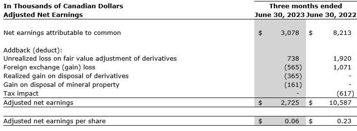Net earnings of $3.3-million or six cents per share for Q2 2023 compare with net earnings of $8.7-million or 18 cents per share in Q2 2022. Adjusted net earnings per share of six cents in the current quarter compare with adjusted net earnings per share of 23 cents per share in Q2 2022. The main adjusting items in the second quarter of this year are unrealized losses on derivatives related to the revaluation of share purchase warrants on junior mining equities, realized gains on the disposal of such share purchase warrants, foreign exchange and gains on disposal of mineral properties.