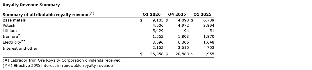 Lithium revenue of $5.4-million grew following the corporation's acquisition of Lithium Royalty Corp. (LRC) on March 6, 2026. There are four operating royalties in the portfolio, including the Goulamina, Grota do Cirilo, Tres Quebradas and Mariana royalties. The Finniss project is also currently in the process of restarting with first concentrate shipments expected in Q4 of this year.