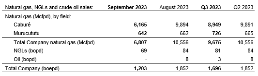 September sales volumes averaged 1,203 barrels of oil equivalent per day, including natural gas sales of 6.8 million cubic feet per day and associated natural gas liquids sales from condensate of 69 barrels of oil per day, bringing its average sales volumes to 1,696 boe/d in the third quarter of 2023.