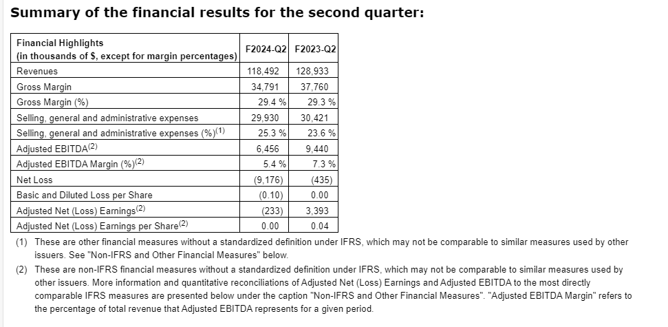 Adjusted EBITDA (earnings before interest, taxes, depreciation and amortization) amounted to $6.5-million for the three months ended Sept. 30, 2023, representing a decrease of $2.9-million, or 31.6 per cent, from $9.4-million for the three months ended Sept. 30, 2022. As explained above, decreased revenues and gross margin, including a $1.1-million provision on tax credits receivable related to previous periods, partially offset by decreased selling, general and administrative expenses. Adjusted EBITDA margin was 5.4 per cent for the three months ended Sept. 30, 2023, compared with 7.3 per cent for the three months ended Sept. 30, 2022.