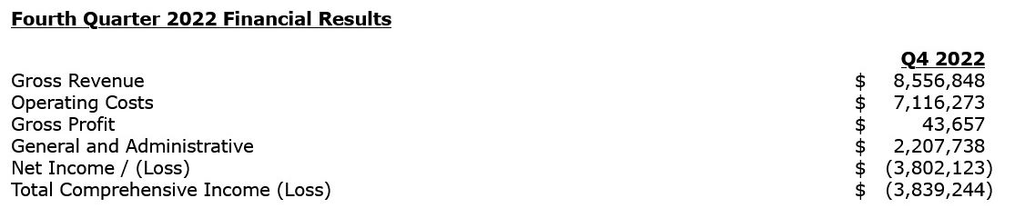 Fourth Quarter 2022 Financial HighlightsGross revenue of $8,556,848 for the 4th quarter 2022 versus gross revenue of $3,281,013 for the 4th quarter 2021, an increase of 160% driven mainly by increased demand for industrial sand in AMI Silica LLC. During Q4-2022, AMI Silica LLC consistently shipped over 80,000 tons of sand per month.Operating loss of $4,572,251 in Q4 2022 versus operating loss of $684,264 in Q4 2021 due mainly to increased depreciation expense and a write-down of resource properties and aggregates inventory.Operating expenses of $7,116,273 in Q4 2022 versus operating expenses of $2,980,250 in Q4 2021.