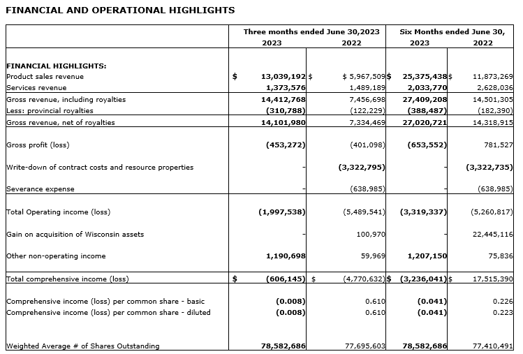 In the second quarter of 2023, Athabasca reported consolidated revenue of $14.4-million (compared with $7.5-million in Q2 2022), a gain of 92 per cent, driven mainly by increasing revenue from industrial sand. Industrial sand revenue was $13.0-million, which is 90 per cent of reported consolidated revenue. Total comprehensive loss in Q2 2023 is $606,145, versus a total comprehensive loss of $4,770,632 in Q2 2022, an improvement of $4,164,487. Athabasca recognized a gross profit of negative $453,272 in Q2 2023, versus gross profit of negative $401,098 in Q2 2022. The corporation incurred a depreciation, depletion and amortization (DDA) expense of $1,306,036 in Q2 2023, versus a DDA expense of $1,012,177 in Q2 2022.