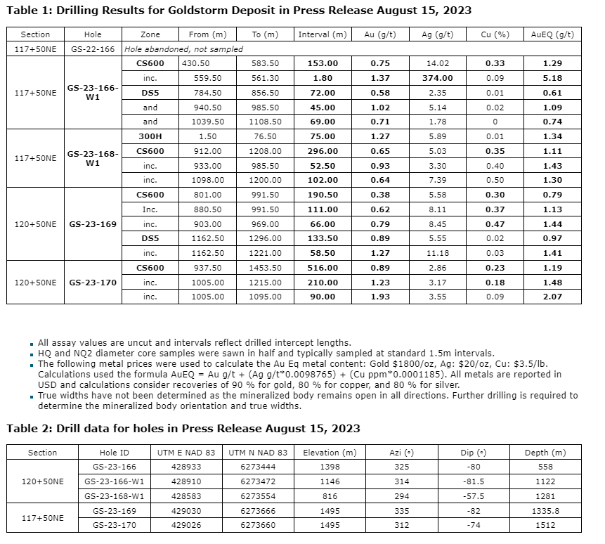 GS-23-166-W1: This hole targeted the northern aspects of the CS-600 and DS5 domains of the Goldstorm deposit. The hole first intersected the northern aspect of the CS-600 domain in an area that was classified as inferred in the April, 2023, mineral resource estimate (MRE). The hole then successfully intersected DS5 domain mineralization at approximately 115 m outside and to the northwest of the previous DS5 domain boundary. Highlights include 153 m grading 1.29 grams per tonne gold equivalent (0.75 g/t gold, 14.02 g/t silver, 0.33 per cent copper) with a 1.8 m intercept of 5.18 g/t AuEq (1.37 g/t Au, 374.0 g/t Ag, 0.09 per cent Cu). Several mineralized zones were encountered throughout the DS5 domain, including 45 m grading 1.09 g/t AuEq (1.02 g/t Au, 5.14 g/t Ag, 0.02 per cent Cu).