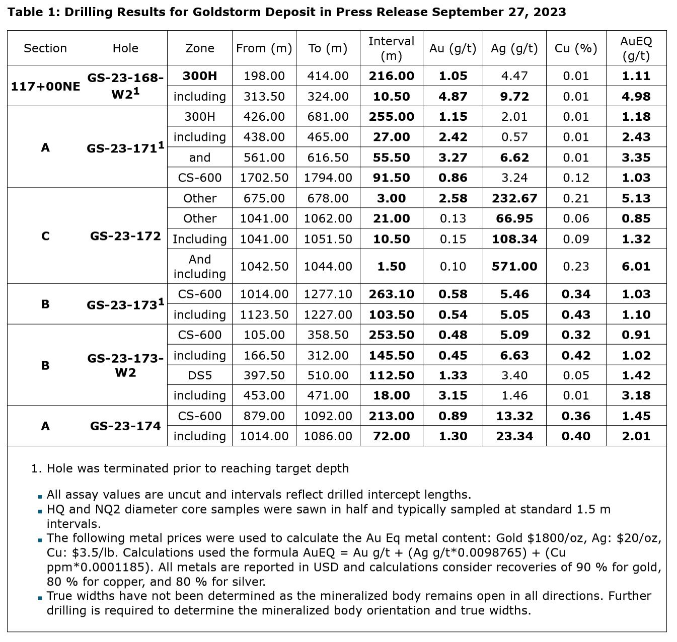 Ken Konkin, President and CEO, comments: "Once again we have been rewarded from our bold step-out drilling on the Goldstorm Deposit. These recent intercepts, outside the limits used for the April 28, 2023 Mineral Resource, continue to expand the size of the deposit and, at the same time, infill drilling has successfully defined large blocks containing strong gold, silver and copper mineralization within drill inferred areas. Our objective is to continue to explore the deposit limits to the northwest, north and northeast, thereby increasing the volume of the Mineral Resource while maintaining the higher gold, silver and copper grades of our most recent Mineral Resource Estimate. Our fundamental priority for continued exploration will be to define the limits of the known domains that comprise the Goldstorm Deposit and to upgrade areas of Inferred Resources to the Indicated category.
