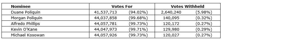 A total of 44,177,953 common shares, representing 32.19 per cent of the votes attached to all outstanding shares as at the record date for the meeting, were represented at the AGSM.