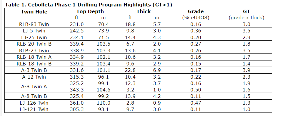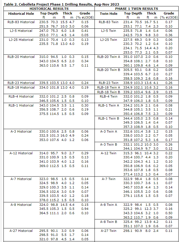 The phase I drill program consisted of 26 drill holes averaging 336 feet (112 metres) deep for a total of 9,530 feet (2,904 metres). Radiometric equivalent U3O8 (triuranium octoxide) grade (percent eU3O8) values closely match historical data from nearby holes completed by Sohio Western Mining Company from over 50 years ago. The attached tables provide highlights from the phase 1 drill program and a direct comparison of the historical drilling. The outstanding results presented are a testament to the quality of the Cebolleta deposit and Sohio's previous work that is the foundation of the 18.98-million-pound U3O8 historical resource that the company is confident will be brought current as part of the next two phases of drilling. The reliability of the historical estimate is considered reasonable, but a qualified person has not done sufficient work to classify the historical estimate as a current mineral resource and the company is not treating the historical estimate as a current mineral resource. The purpose of the confirmation drilling is to accomplish this task.